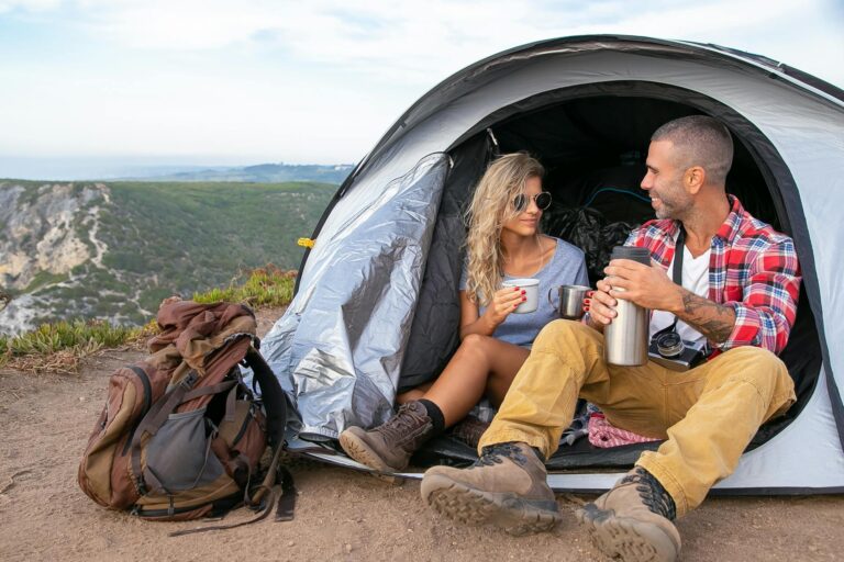 A couple in swimwear with float tubes exploring a lush waterfall in Bali, Indonesia.